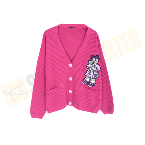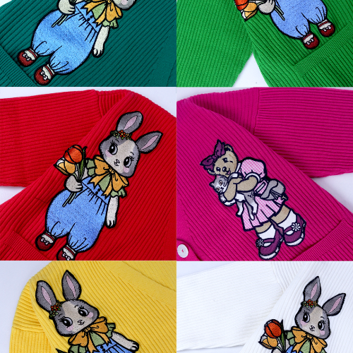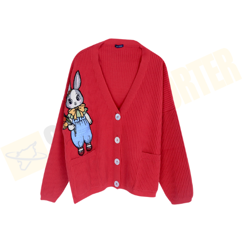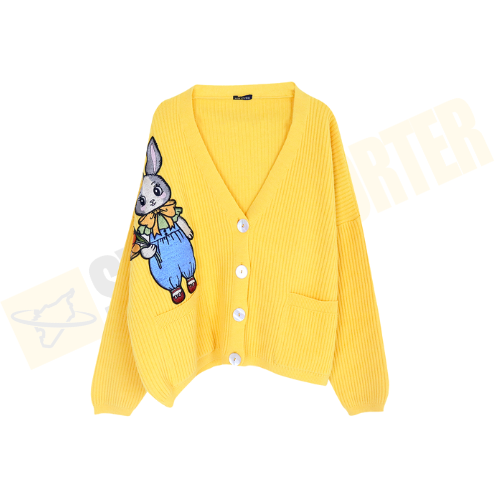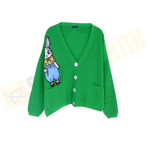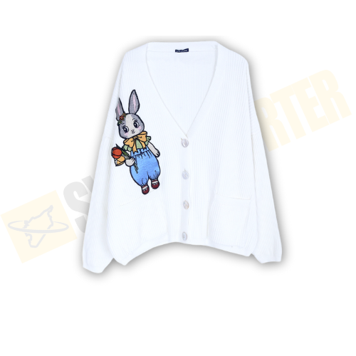 على شكل V وأزرار بيضاء متناسقة. اللمسة الأبرز هي طبعة الأرنب